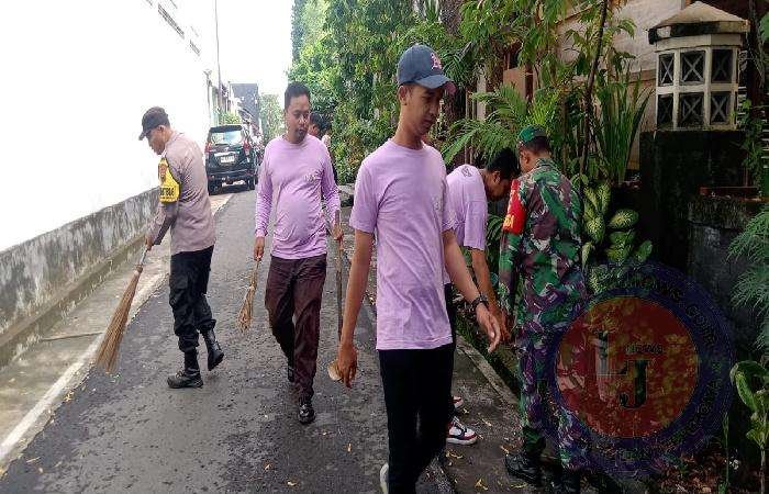 Koramil 02/Banjarsari, Kodim 0735/Surajarta Serma M. Nasirin dan Serka Supadmo bersama Bhabinkamtibmas Kelurahan Nusukan Aipda Mujiono bersama Tim Saberling Pegawai dan Linmas Kelurahan Nusukan melaksanakan kerja bhakti pembersihan diseputaran Lingkungan Kelurahan Nusukan Jalan Sriwijaya Utara II No 5 Kelurahan Nusukan, Kecamatan Banjarsari, Kamis (08/02/2024).