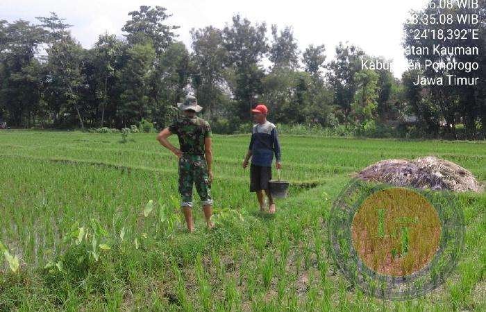 Seperti yang dilakukan oleh Sertu Sasmito, anggota Koramil Tipe B 0802/08 Sampung, Kodim 0802/Ponorogo, hari ini dia bersama warga desa binaan yang tergabung dalam Poktan (Kelompok Tani) Sumorobangun melaksanakan pemupukan padi di Dusun Sejeruk, Desa / Kecamatan Kauman, Kabupaten Ponorogo.