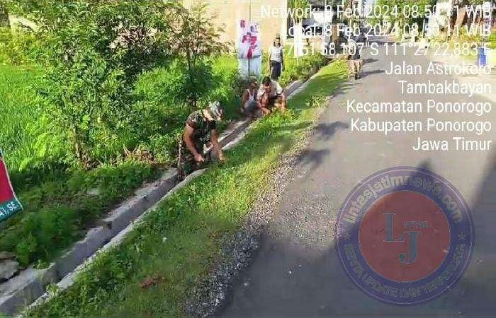 PONOROGO lintasjatimnews.com – Sertu Adin, anggota Koramil Tipe B 0802/01 Kota Ponorogo hari ini bersama warga Kelurahan Tambakbayan melaksanakan kerja bakti pembersihan lingkungan di sepanjang kanan dan kiri jalan Kelurahan Tambakbayan, Kecamatan/Kabupaten Ponorogo, Jumat (09/02/2024).