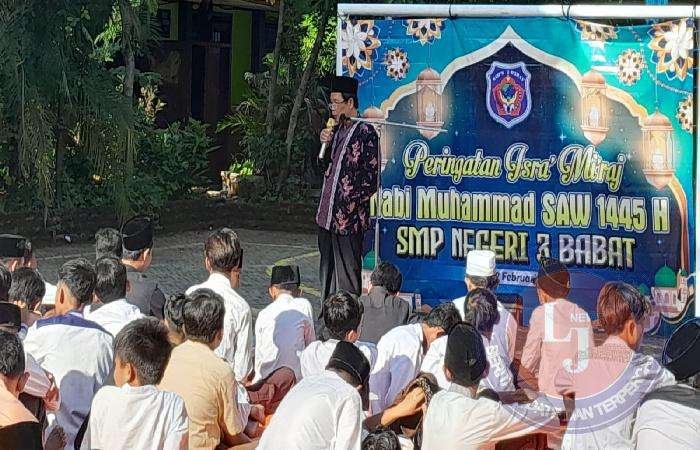 “Salah satu peristiwa luar biasa yang ditunjukkan Allah SWT yang menjadi tanda kekuasaan-Nya adalah Isra Miraj Nabi Muhammad SAW,” ujar Kepala SMP Negeri 3 Babat ini