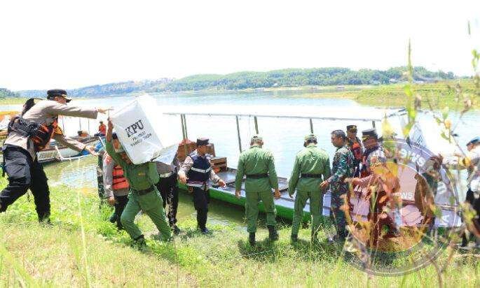 Ada beberapa kotak suara yang tersegel setelah dari gudang logistik dibawa PPK dan berlanjut didistribusikan ke TPS, menggunakan perahu menyeberangi waduk Pondok, yang masuk wilayah Kec. Bringin pada Selasa (13/2/2024)
