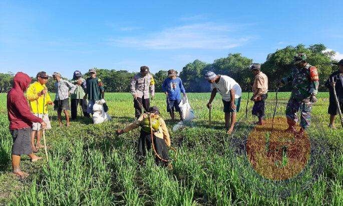 Babinsa Koramil 0805/05 Karangjati Serda Eko Prayitno bersama petani langsung terjun ke sawah untuk mengendalikan populasi hama tikus agar tidak berkembang biak. Sebab, tikus mampu merusak padi yang sedang tumbuh di areal persawahan.