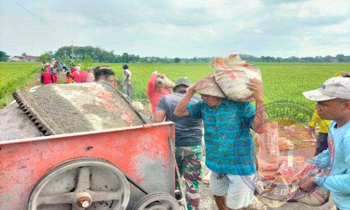 SRAGEN lintasjatimnews.com – TNI Manunggal Membangun Desa Reguler ke-119 Kodim Sragen Tahun 2024 di Desa Gedongan, Kecamatan Plupuh memasuki hari ke 3. (Kamis, 22/02/2024). Suasana semangat gotong royong yang tinggi antara warga dan Tim Satgas dalam mengerjakan cor blog jalan sepanjang ± 1500 M yang merupakan jalan tembus menghubungkan 2 desa, yaitu Desa Gedongan dan Desa Jabung.