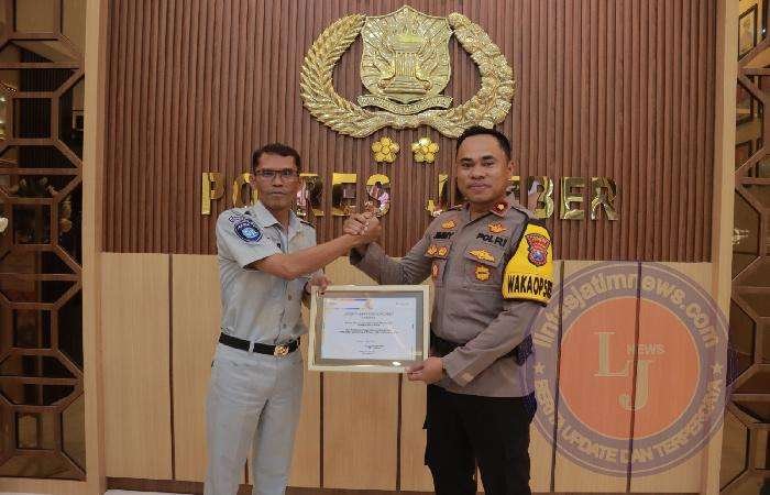 Piagam penghargaan diserahkan langsung oleh Kepala Perwakilan Jasa Raharja Jember, Abdul Bar, S.E., AWP, dan diterima oleh Wakapolres Jember, Kompol Jimmy Heryanto Hasiholan SH SIK di lobbi Polres Jember.