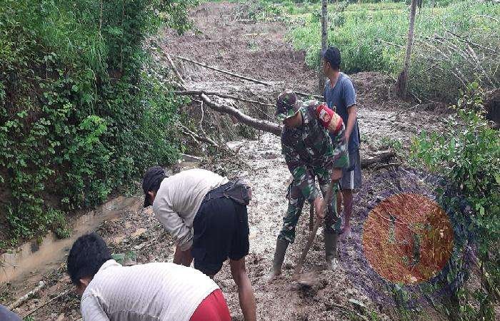Babinsa Koramil 10/Wuryantoro Serda Dwiyanto bersama Kades,Ketua RW serta warga mengunakan alat seadanya secara gotong royong melaksanakan kegiatan karja bakti menyingkirkan tumpukan material longsoran dan namun berkat kesigapan Babinsa dan Warga masyarakat tumpukan material longsor kini bisa di singkirkan dari badan jalan.