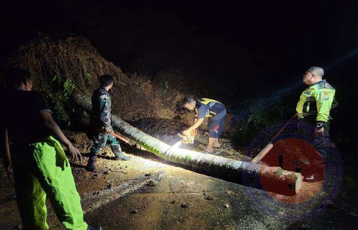 Akibatnya material longsong tanah bercampur batu menutup sebagian badan jalan dan menghambat arus lalu lintas dari dua arah. Tak hanya itu, pohon kelapa juga tumbang bersama material longsor hingga melintang menutup jalan.