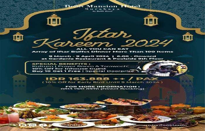 Paket berbuka puasa yang ditawarkan adalah “Iftar Kareem”, yaitu paket berbuka puasa bersama dengan menu All You Can Eat. Dengan harga Rp 163.888++ / pax, akan disajikan lebih dari 100 varian item, free takjil dan tersedia dalam opsi area baik itu indoor, outdoor, maupun semi-terrace yang membuat acara buka bersamamu dengan keluarga, pasangan maupun kerabat di Bess Mansion Hotel Surabaya menjadi lebih menarik lagi.