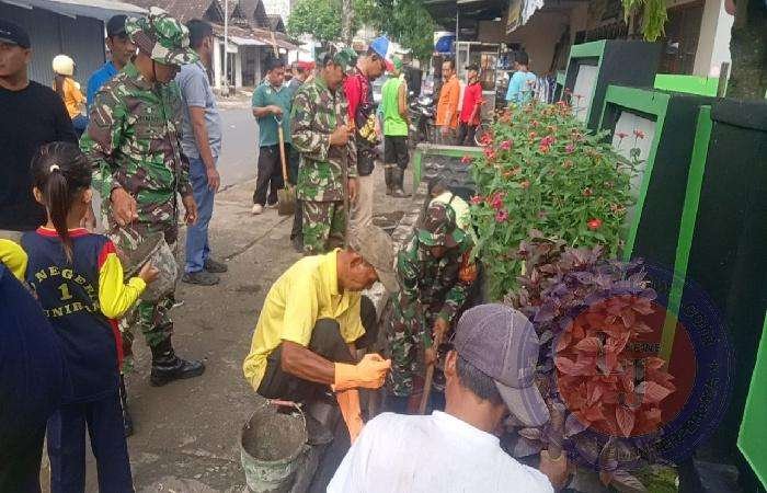 Babinsa Serma Mulyoto bersama warga setempat bahu membahu membersihkan saluran air dan gorong gorong yang tersumbat oleh tumpukan sampah hingga lumpur.
