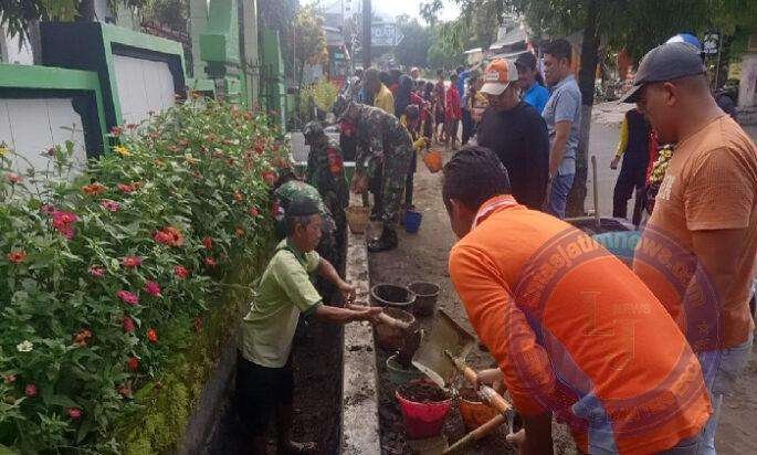Babinsa Serma Mulyoto bersama warga setempat bahu membahu membersihkan saluran air dan gorong gorong yang tersumbat oleh tumpukan sampah hingga lumpur.