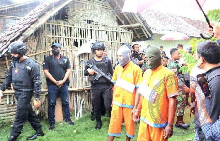 Nampak ratusan warga sangat antusias melihat keduanya dibawa Polisi ke lokasi kandang sapi milik korban dengan kondisi kaki pincang akibat ditembak polisi karena melawan saat ditangkap.