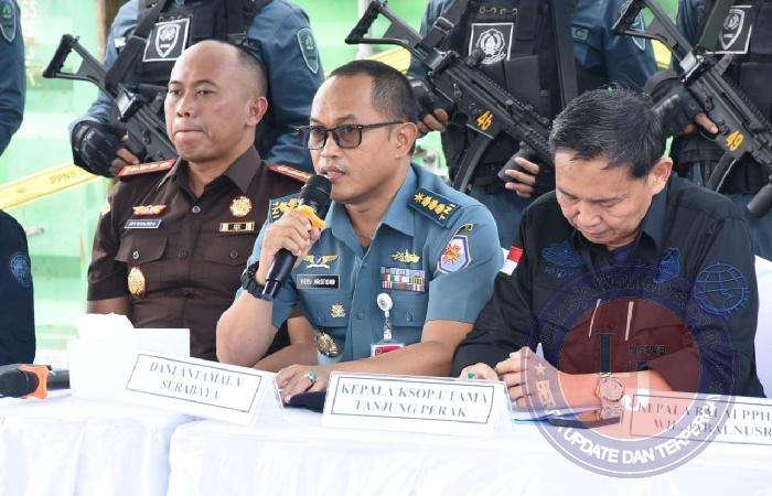 SURABAYA lintasjatimnews.com – Komandan Pangkalan Utama TNI Al (Danlantamal) V Brigjen TNI Marinir Joni Sulistiawan, S. H., M. Han., diwakilkan Asisten Intelijen (Asintel) Kolonel Laut (P) Heru Kristiono mengikuti Konferensi Pers Hasil Operasi Pengamanan Peredaran Hasil Hutan Kayu Ilegal di Surabaya di Depo PT Spil Jl. Raya Tambak Langon Suranaya. Selasa (19/03/3034)
