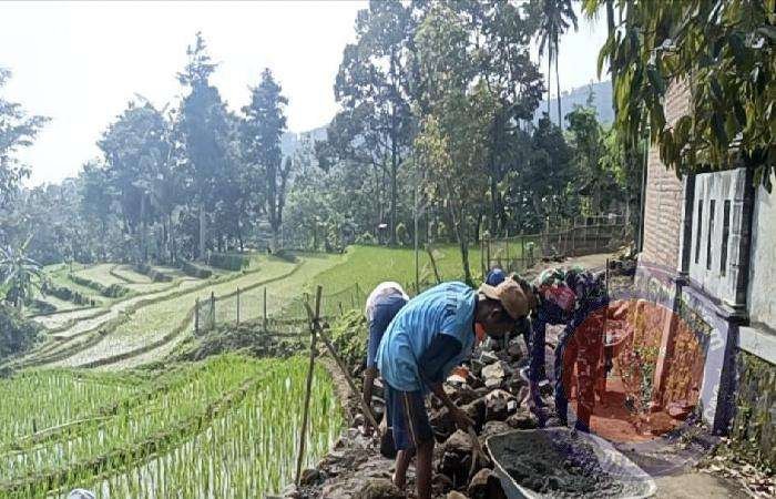 Pada kesempatan ini Serda Sigit bersama warga masyarakat melaksanakan gotong royong melaksanakan penataan batu untuk akses pembuatan talut dan perbaikan irigasi.