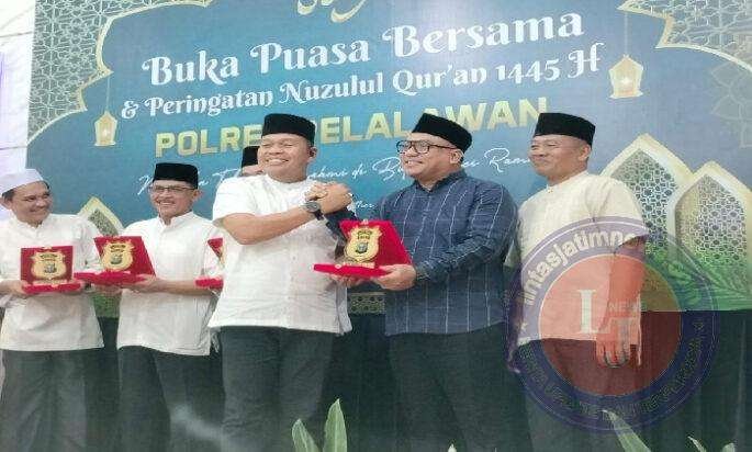 PELALAWAN lintasjatimnews.com – Polres Pelalawan bersama jajaran menggelar buka puasa bersama dengan berbagai elemen masyarakat dan peringatan Nuzulul Qur’an 1445 Hijriah. Kegiatan itu, sekaligus memberikan santunan kepada anak yatim piatu, Kamis (4/4/2024).