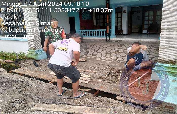 Seperti yang dilakukan Serda Dodik anggota Koramil Tipe B 0802/04 Siman, Kodim 0802/Ponorogo yang sehari hari menjadi Babinsa Jarak dimana hari ini membantu warga Desa Jarak Kecamatan Siman Kabupaten Ponorogo dalam pembuatan gorong – gorong di depan rumah milik salah satu warga.