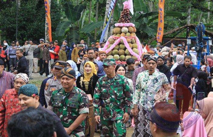 TRENGGALEK lintasjatimnews.com – Suasana meriah menyelimuti Taman Watulawang Desa Wisata Durensari Sawahan Dusun Tenggong, Desa Sawahan, Kecamatan Watulimo, Kabupaten Trenggalek, Minggu (21/4/2024). Dandim 0806/Trenggalek, Letkol Czi Yudo Aji Susanto, S.Sos., bersama Forkopimda memainkan peran utama dalam memeriahkan Event Internasional Durio Festival tahun 2024. Mereka tidak hanya hadir, tetapi juga terlihat memancarkan semangat yang luar biasa dalam mengikuti acara Kirab tumpeng Durian, menempuh rute yang memukau dari RT. 01 RW. 01 Desa Sawahan hingga Taman Watulawang Desa Sawahan, dengan menempuh perjalanan sejauh 2 Km.