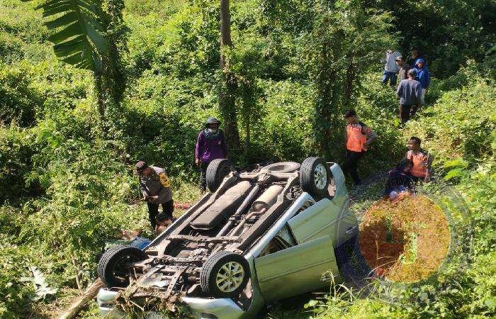 Saat terjun itu mobil berhenti dengan posisi terbalik di dalam jurang.