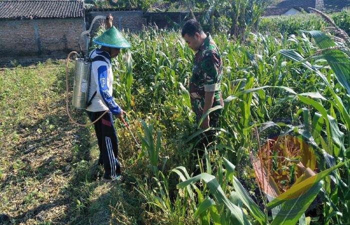 Bersama Bapak Kholik pemilik ladang jagung yang tergabung dalam Kelompok Tani (Poktan) Jembangan Makmur Kelurahan Mangunsuman Kecamatan Siman Kabupaten Ponorogo tersebut Sertu Sudarwanto ikut melakukan perawatan atau penyemprotan tanaman jagung serta membersihkan gulma atau rumput pengganggu yang ada di sekitar tanaman.