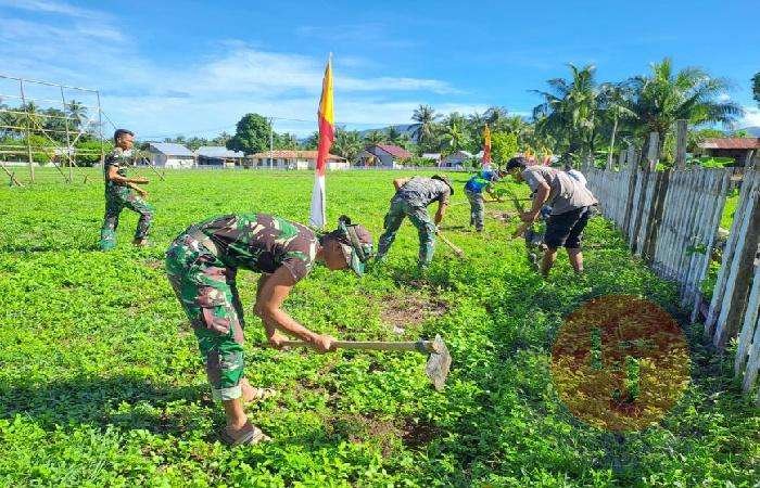Dengan penuh semangat, anggota Satgas TMMD dan warga desa bergotong-royong menanam berbagai jenis pohon di sekitar lapangan bola. Mulai dari pohon-pohon pelindung seperti pohon jati dan mahoni, hingga pohon buah seperti mangga dan rambutan, ditanam dengan harapan akan memberikan manfaat jangka panjang bagi lingkungan dan kesejahteraan masyarakat.