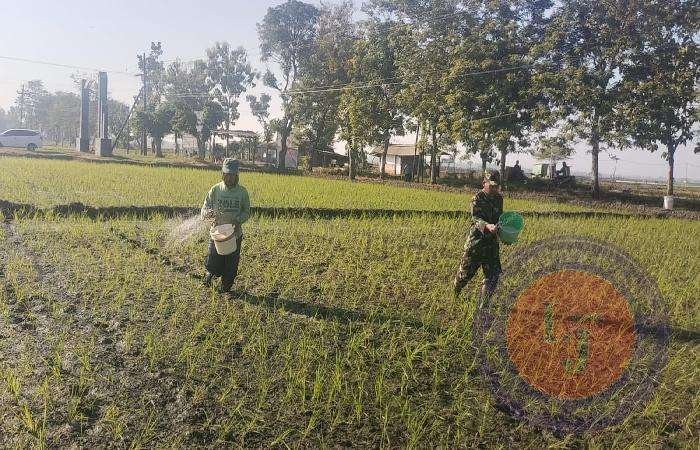 NGAWI lintasjatimnews.com – Program Wujudkan Ketahanan Pangan, Babinsa Koramil 0805/04 Padas Dampingi Petani padi dalam melakukan pemupukan secara rutin di sawah warganya di Desa Tungkulrejo, Kecamatan Padas, Kabupaten Ngawi, Rabu (15/05/2024).