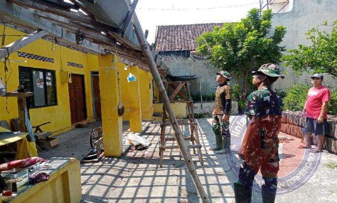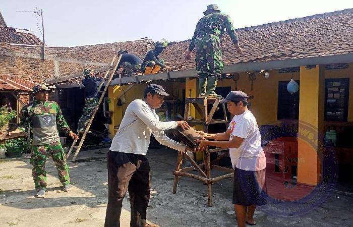 Terlihat para anggota Satgas TMMD sedang membongkar rumah Bu Wahyuni untuk dibangun kembali agar bisa menjadi rumah yang layak untuk ditempati.