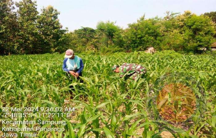 PONOROGO lintasjatimnews.com – Sertu Ajis N salah satu anggota Koramil Tipe B 0802/08 Sampung, Kodim 0802/Ponorogo yang setiap hari bertugas menjadi Babinsa Sampung hari ini melakukan kegiatan pendampingan petani jagung di Desa / Kecamatan Sampung, Kabupaten Ponorogo, Rabu (22/05/2024).