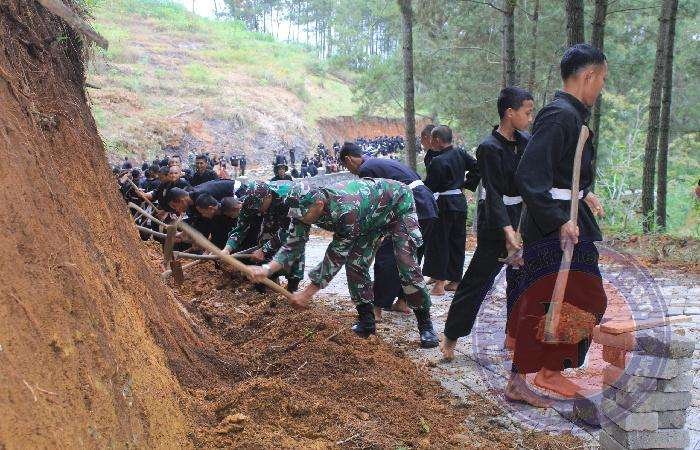 TRENGGALEK lintasjatimnews.com – Satuan Tugas (Satgas) TNI Manunggal Membangun Desa (TMMD) Reguler ke-120 Kodim 0806/Trenggalek menggandeng perguruan silat Persaudaraan Setia Hati Terate (PSHT) Ranting Pule untuk mempercepat pembangunan jalan penghubung antara Desa Tanggaran di Kabupaten Trenggalek dan Desa Cempoko di Kabupaten Ponorogo. Kolaborasi ini terlihat dalam aksi mereka yang kompak dan penuh semangat saat berjibaku dalam pemasangan paving jalan, Minggu (26/5/2024).