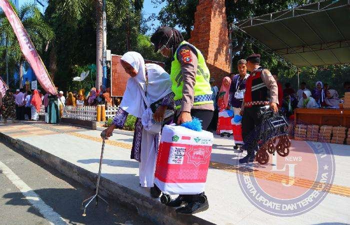 Terlihat humanis Polisi yang melakukan pengamanan ikut membantu menuntun jamaah lansia menuju bus dan beberapa Polisi lainnya turut membantu membawakan koper para calon jamaah haji.