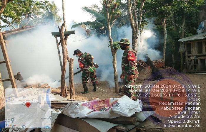 PACITAN lintasjatimnews.com – Upaya cegah dini terhadap penyebaran penyakit demam berdarah terus dilakukan oleh Koramil 0801/01 Pacitan, Kodim 0801/Pacitan, bekerjasama dengan Puskesmas Tanjungsari melalui fogging.