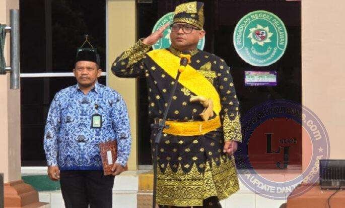 PELALAWAN lintasjatimnews.com – Pada upacara dengan tema “Pancasila jiwa pemersatu bangsa menuju Indonesia emas 2045,” Tampak Ketua PN Pelalawan Benny Arisandy, SH.MH yang bergelar Datuk Seri Abdi Arif Penimbang Negeri saat bertindak sebagai inspektur upacara berpakaian baju adat melayu Riau.
