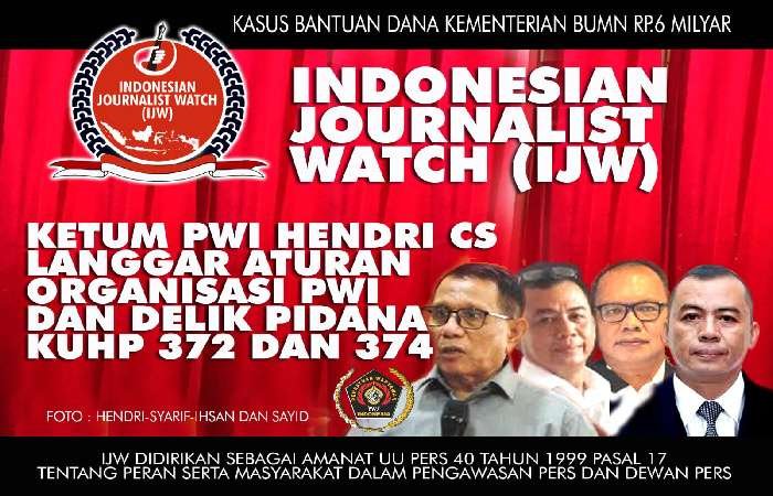 JAKARTA lintasjatimnews.com — Indonesian Journalist Watch (IJW) menilai dalam masalah bantuan dana hibah BUMN untuk UKW (Uji Kompetensi Wartawan) Rp. 6 milyar, Ketua Umum PWI (Persatuan Wartawan Indonesia), Hendri Ch.Bangun dan kroninya telah melakukan pelanggaran aturan organisasi PWI dan pelanggaran hukum penggelapan sesuai KUHP Pasal 372 dan 374 atau Pasal 488 UU I/2023.