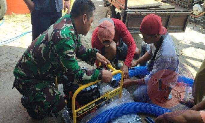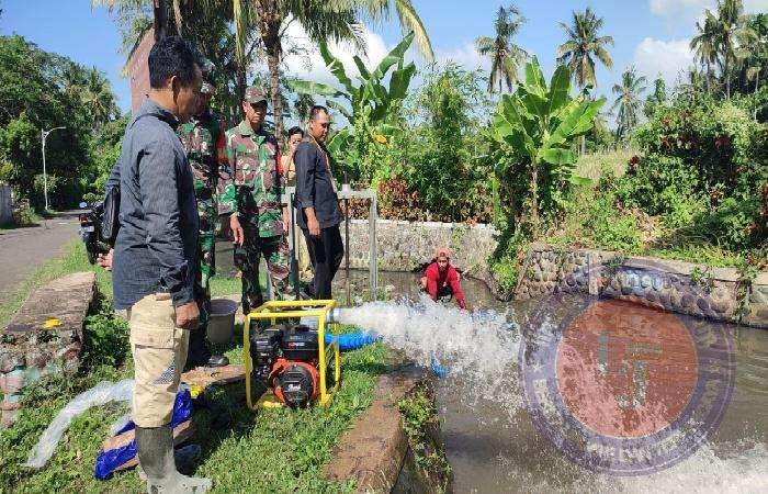 Anggota Koramil 0825/03 Glagah melaksanakan pengairan dengan pompa air Di sawah milik bapak Asto yang belokasi di Dusun Krajan Desa Olehsari Kecamatan Glagah Kabupaten Banyuwangi. Senin (10/06/2024).