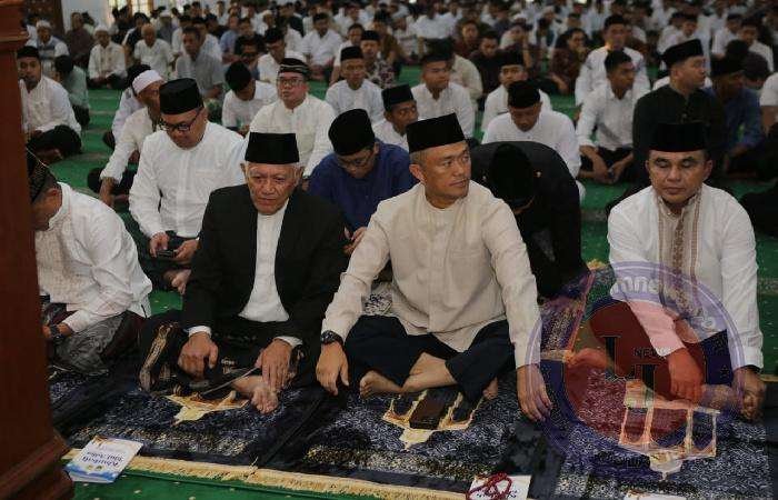 SURABAYA lintasjatimnews – Kapolda Jawa Timur Irjen Pol Imam Sugianto bersama Wakapolda Jawa Timur Brigjen Pol. Akhmad Yusep Gunawan, serta para Pejabat Utama (PJU) Polda Jatim, mengikuti Sholat Ied di Masjid Arif Nurul Huda Mapolda Jatim. Senin (17/6/2024) pagi.