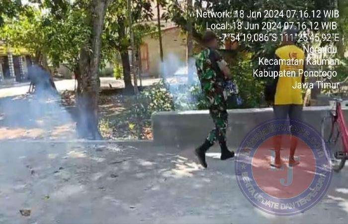 PONOROGO lintasjatimnews – Serda Ferminus Ato anggota Koramil Tipe B 0802/05 Kauman Kodim 0802/Ponorogo yang setiap hari bertugas menjadi Bintara Pembina Desa (Babinsa) Ngrandu hari ini melakukan pendampingan kegiatan fogging / pengasapan nyamuk di Dusun Wates Desa Ngrandu Kecamatan Kauman Kabupaten Ponorogo, Selasa (18/06/2024).