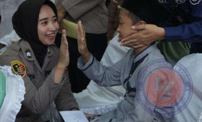 Senyumannya yang ramah, Polwan Polres Mojokerto ini mampu menenangkan anak – anak yang mengikuti khitan masal.