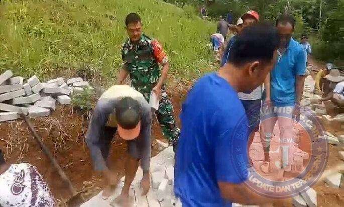 TRENGGALEK lintasjatimnews – Babinsa Gemaharjo, Sertu Beny Haryanto, yang merupakan anggota Koramil 0806-07 Watulimo Kodim 0806/Trenggalek, bersama warga Dusun Krajan, Desa Gemaharjo, Kecamatan Watulimo, Kabupaten Trenggalek, melaksanakan kegiatan gotong royong pemavingan jalan kampung, Selasa (18/6/2024).