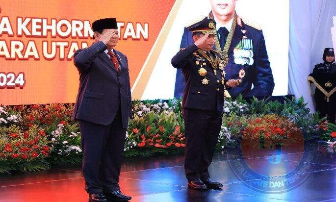 JAKARTA lintasjatimnews – Menteri Pertahanan RI sekaligus presiden terpilih Prabowo Subianto menerima tanda kehormatan Bintang Bhayangkara Utama dari Polri. Penyematan tanda kehormatan itu dilaksanakan di Rupattama Markas Besar (Mabes) Polri, Jakarta Selatan, pada Kamis (20/6/2024) siang.