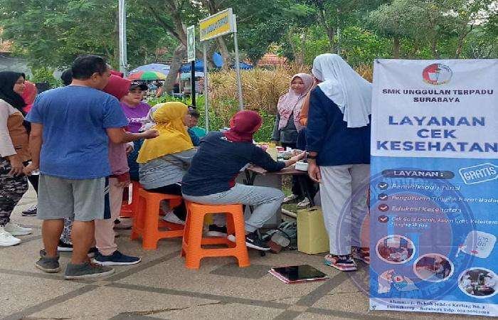 SURABAYA lintasjatimnews – Siswa SMK Unggulan Terpadu Surabaya Jurusan Keperawatan kelas XI mengadakan Bakti Sosial Pemeriksaan Kesehatan Gratis di Taman Cahaya Pakal Surabaya, Minggu 23/6/2024.