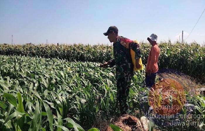 Di lahan jagung milik Pak Bokari ( Anggota Poktan Tunas Karya ) Desa Sawoo tersebut Sertu Moh Yasin melakukan pendampingan dan membantu penyemprotan tanaman jagung yang saat ini mencapai usia 37 hari.