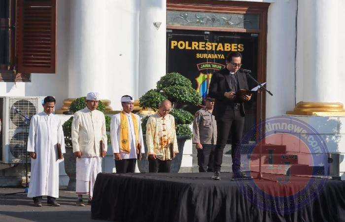 Doa bersama tersebut dihadiri para tokoh agama Islam, Kristen, Katolik, Hindu, Budha, Konghucu, dan para PJU Polrestabes, Kapolsek jajaran, serta seluruh personel Polri/ASN Polrestabes Surabaya.