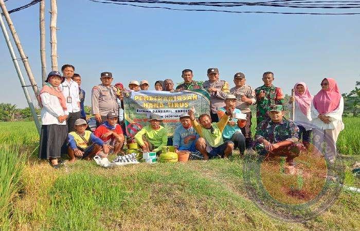 Anggota Koramil Geneng bersama Bhabinkamtibmas dan petani mengendalikan populasi hama tikus agar tidak berkembang biak, sebab tikus dapat merusak pertumbuhan padi di persawahan.