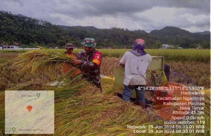 Seperti halnya yang tengah dilakukan oleh Sertu Feri Babinsa Koramil 0801/07 Ngadirojo kali ini, dirinya terjun langsung ke sawah untuk membantu petani dalam memanen padi, berlangsung di Desa Hadiwarno, Kec. Ngadirojo, Kab. Pacitan, Sabtu (29/06/2024).