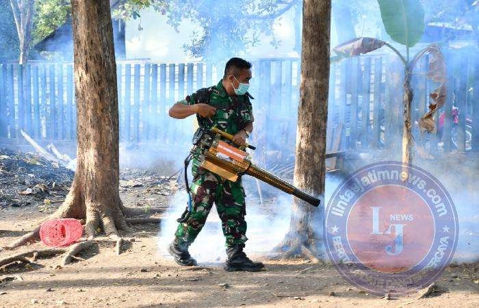 Mulai dari gorong – gorong depan kantor Makodim, parit, ruang kantor staf dan seluruh lingkungan Makodim serta lingkungan kantor Koramil Tipe B 0802/01 Kota semua tak luput dari gempuran asap fogging yang disemprotkan oleh petugas sehingga diharapkan semua nyamuk yang ada mati tak tersisa.