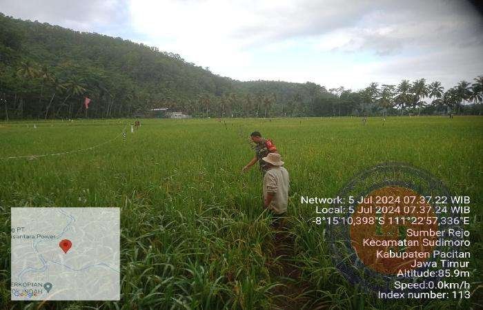 PACITAN lintasjatimnews – Pagi ini Babinsa dari koramil 0801/09 Sudimoro Kodim 0801/Pacitan Kopka Suprianto terlibat aktif dalam membantu para petani Padi di wilayah binaannya desa Sumberejo Kecamatan Sudimoro Kabuaten Pacitan.