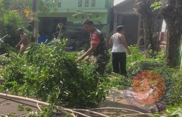 Babinsa dan warga mulai membersihkan area sekitar rumah Bp. Pono, memangkas ranting – ranting pohon trembesi. Babinsa memberikan contoh yang baik dengan turun langsung ke lapangan dan ikut serta dalam kegiatan pembersihan ini.