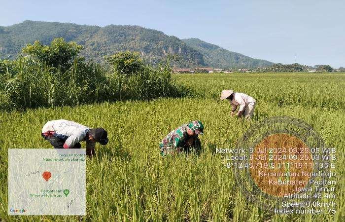 PACITAN lintasjatimnews – Pagi ini Babinsa Koramil 0801/07 Ngadirojo Kodim 0801/Pacitan Sertu Hartopo melaksanakan pendampingan Hanpangan dengan giat perawatan dan pembersihan rumput ( Watun ) tanaman Padi bersama Bpk. Sarif / Poktan Mekar Sari II di wilayah binaan Desa Ngadirojo Kec. Ngadirojo , Kab. Pacitan. Selasa (09/07/2024).