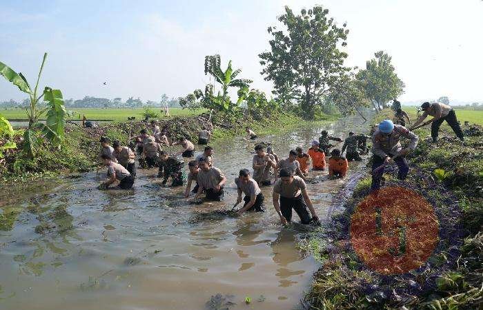 “Kita laksanakan pembersihan aliran sungai yang mengairi areal sawah di kanan kiri sungai ini, alhamdulillah kita sengkuyung bersama, meter permeter jika sudah bersih kita lanjutkan lagi, hingga selesai, tetap semangat paseduluran sak lawase”, imbuh Kapolres.