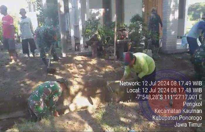 PONOROGO lintasjatimnews – Empat orang anggota Koramil Tipe B 0802/03 Kauman, Kodim 0802/Ponorogo dengan tertua Bati Bakti Koramil Tipe B 0802/05 Kauman Serma Marjoko hari ini melaksanakan kerja bakti bersama warga Desa Pengkol, Kecamatan Kauman Kabupaten Ponorogo, Jumat (12/07/2024).