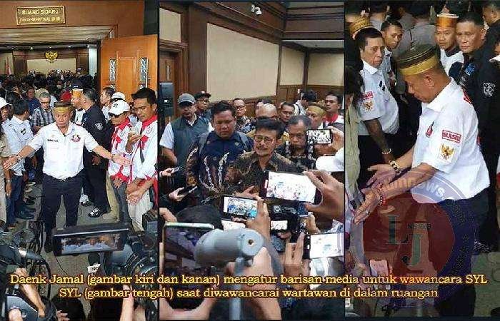 “Namun demikian ketika SYL keluar dari ruang sidang untuk memberikan pernyataan kepada wartawan tiba tiba terjadi desak desakan yang cukup parah dan itu terjadi antara para pengawal SYL bersama aparat kepolisian yang mengawal sidang serta para awak media yang berjubel menunggunya di depan pintu keluar ruangan. Nah, atas kondisi berdesak desakan yang kemudian menimbulkan insiden,” ucap Daenk Jamal.