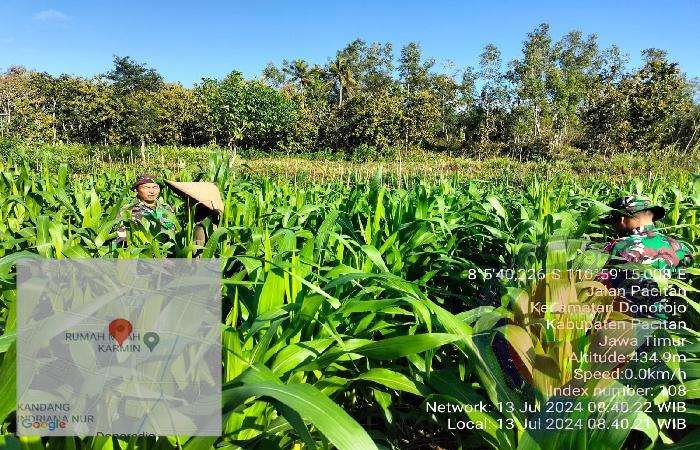 PACITAN lintasjatimnews – Sebagai upaya mendukung Program Ketahanan Pangan (Hanpangan) di wilayah binaan, Bintara Pembina Desa (Babinsa) Serda Hariyanto Koramil 0801/11 Donorojo Kodim 0801/Pacitan melaksanakan pendampingan pertanian dengan membantu petani dalam pemeliharaan dan perawatan pada tanaman jagung bersama bapak mesiran dari Poktan sumber Mulyo di wilayah binaan Desa Donorojo Kec. Donorojo. Sabtu (13/07/2024).