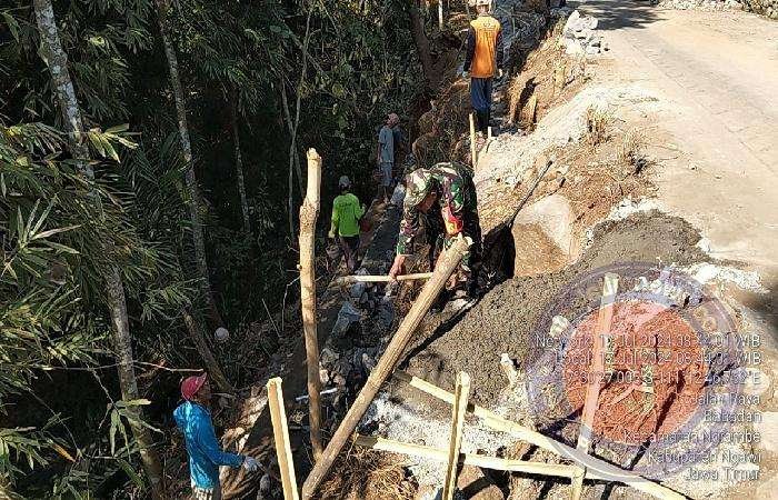 NGAWI lintasjatimnews – Dalam rangka menciptakan kemanunggalan TNI dengan rakyat, anggota Koramil 07/Ngrambe Kodim 0805/Ngawi Serka Mulyadi melaksanakan Karya Bakti membantu masyarakat bangun talud jalan bertempat di Desa Babadan Kecamatan Ngrambe, Senin (17/07/2024).